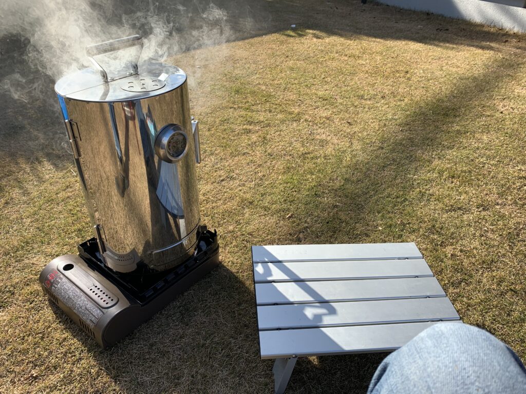 ウッドに火をつけてトレイにセット。あとは放置です。数分でも燻香はつきますが、しっかり香りづけしたい人は60分ほど燻しましょう。
